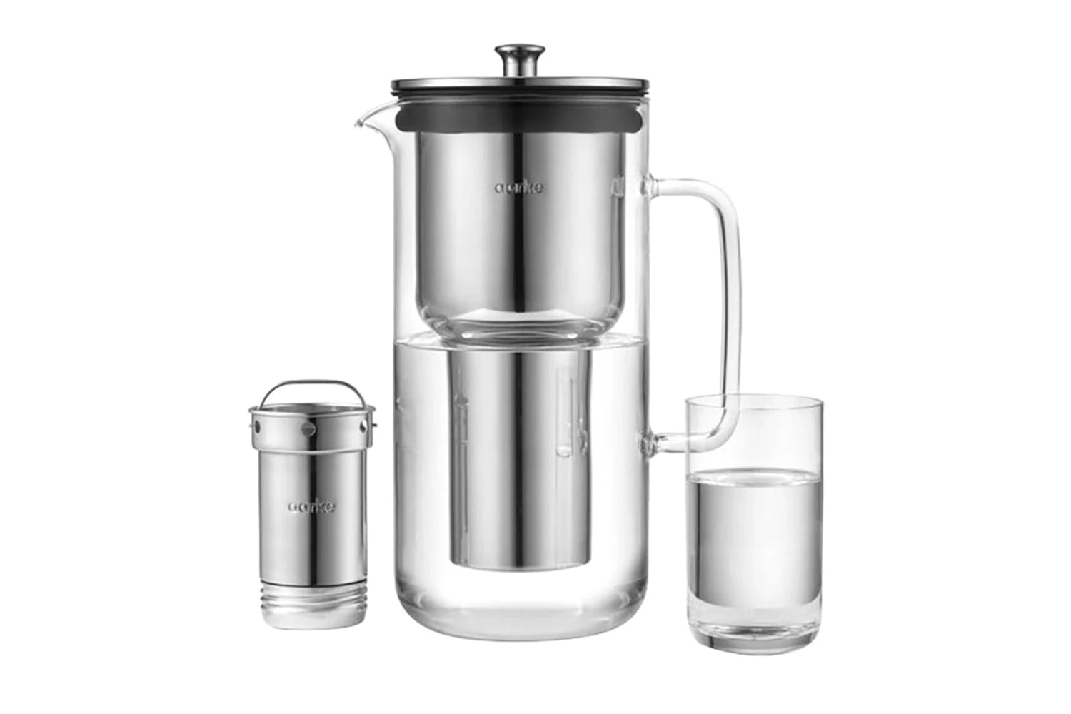Aarke Purifier is a patented water filter jug in glass and stainless steel. Our water filter pitcher makes your tap water cleaner and more pleasurable to drink. The filtering technology is developed in collaboration with BWT and features a refillable steel filter cartridge and filter refill granules. The granules are poured into the cartridge and changed every 4 weeks.