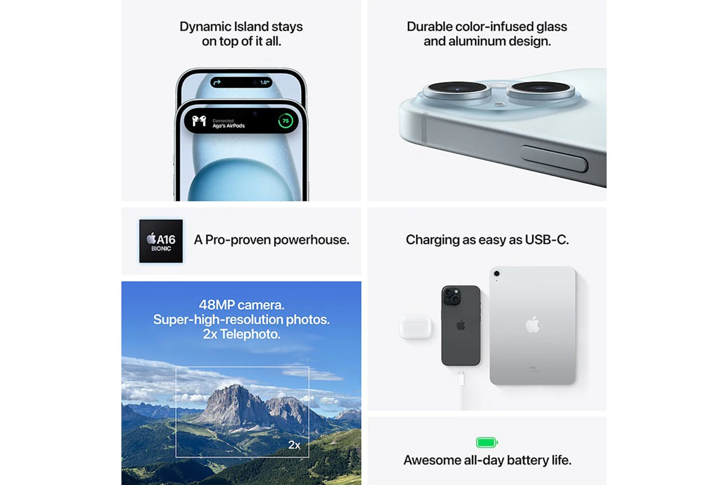 The innovaÂtive new design features back glass that has colour infused throughout the material. A custom dual ion-exchange process for the glass, and an aerospace-grade aluminium enclosure, help make iPhone 15 incredibly durable.