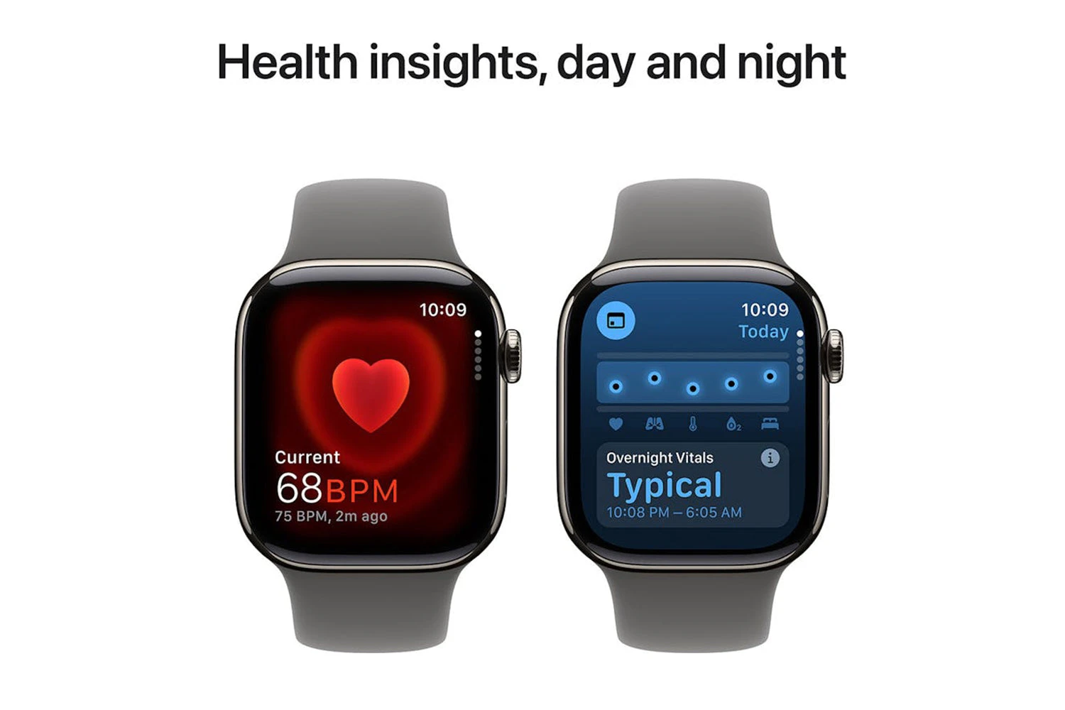 Meet Apple Watch Series 10. A bigger display with more screen area and a thinner, lighter design. Get advanced fitness and health features with Sleep Apnoea Notifications, plus faster charging.