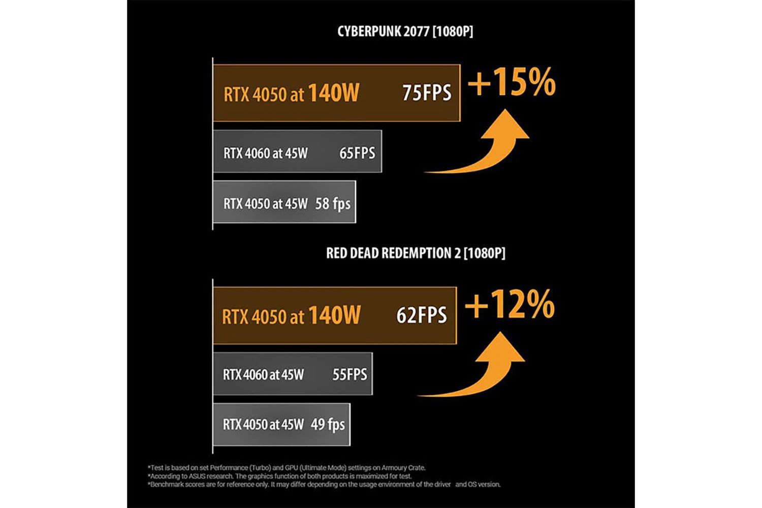 Powered by NVIDIA DLSS 3, ultra-efficient Ada Lovelace arch, and Max-Q Technologies. Featuring up to the NVIDIA GeForce RTX 4060 Laptop GPU with a max TGP of 140W, reliably delivering high frame rates in plenty of modern games even at 1440p.