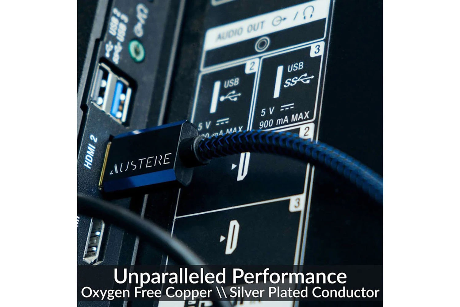 Austere HDMI cable is engineered using the most advanced materials available on the market today. Our Pure Gold Contacts, Oxygen Free Copper, and Silver Plated Conductors won’t erode over time, which ensures a lifetime of peak performance.