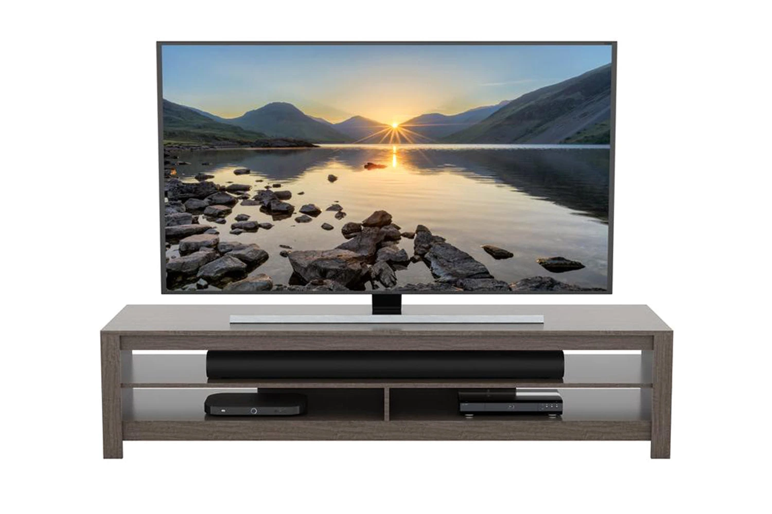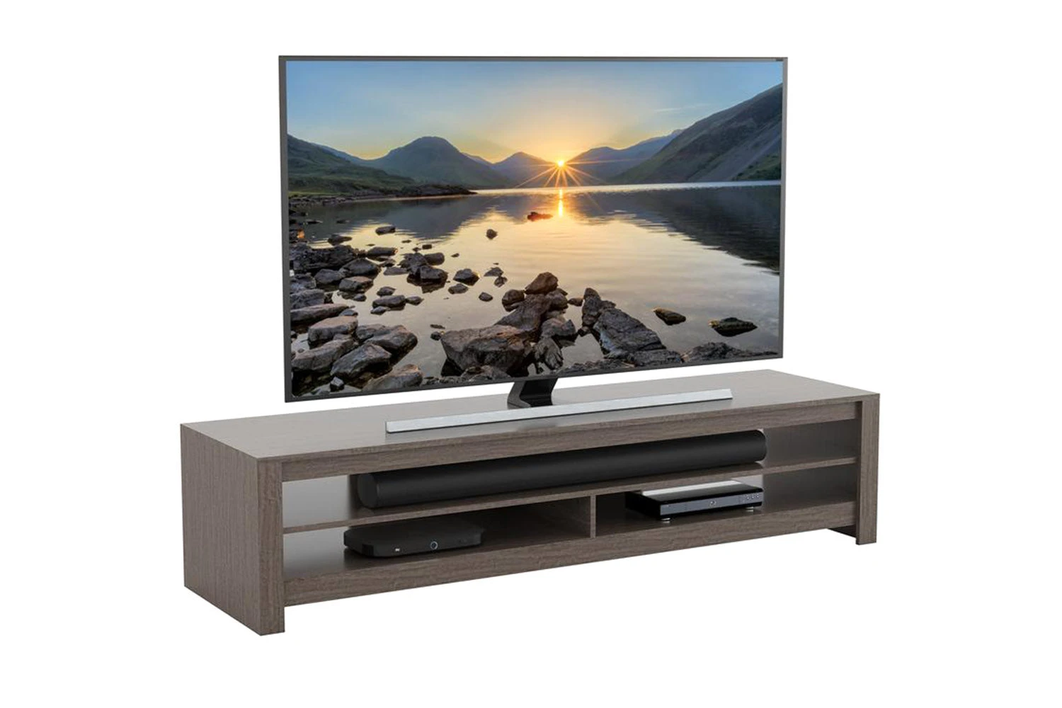 The Calibre is the perfect TV stand for TVs up to 85 inch. It’s minimalist design makes it a great piece of furniture for any room setting. Sturdy construction, with a large open aperture perfect for sound bars, finished in a stylish grey wood effect veneer.