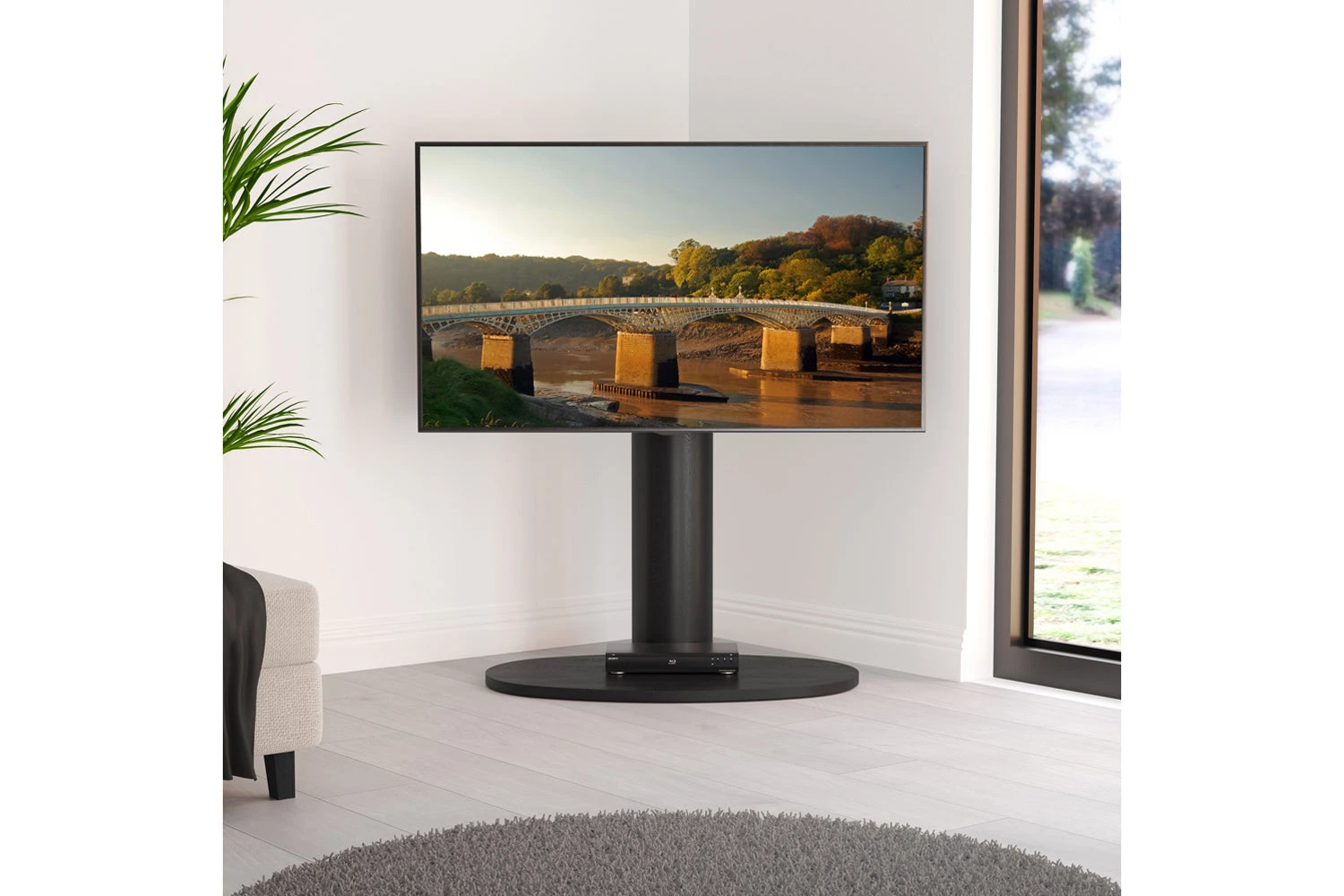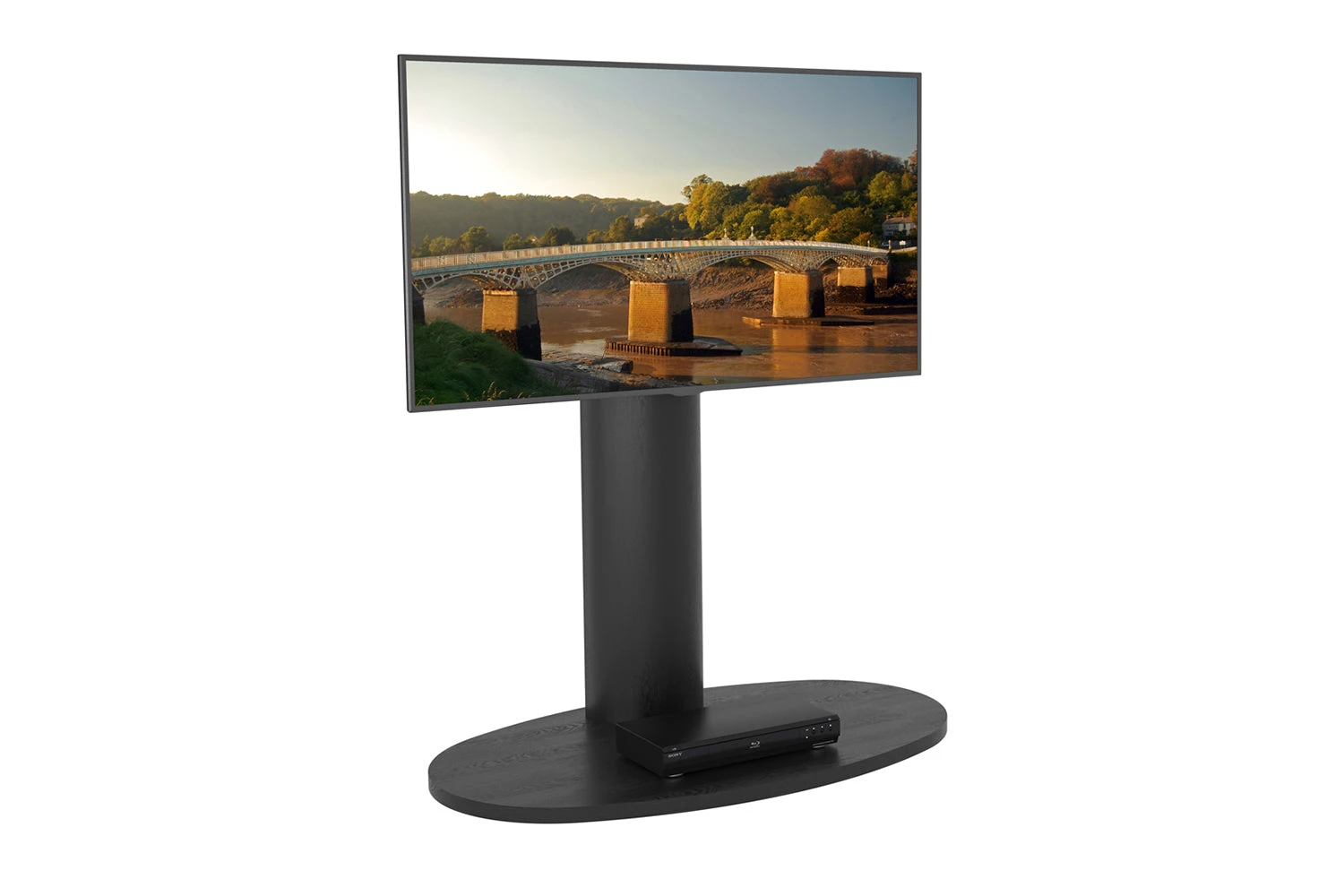 Chepstow One is a stylish free standing column in beautiful real wood veneer, designed for TVs 32-65″ and up to 37 kg in weight. This stand allows you to turn your screen 45 degrees for comfortable viewing angles. The oval shape of Chepstow’s base makes it perfect for positioning in the corner or flat against the wall, and cables can be hidden behind the column for a tidy look. Secure AVF mounting technology protects your TV from accidental knocks or tip-overs.