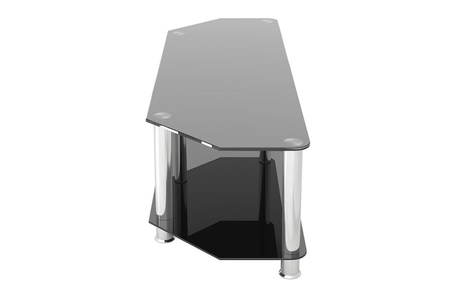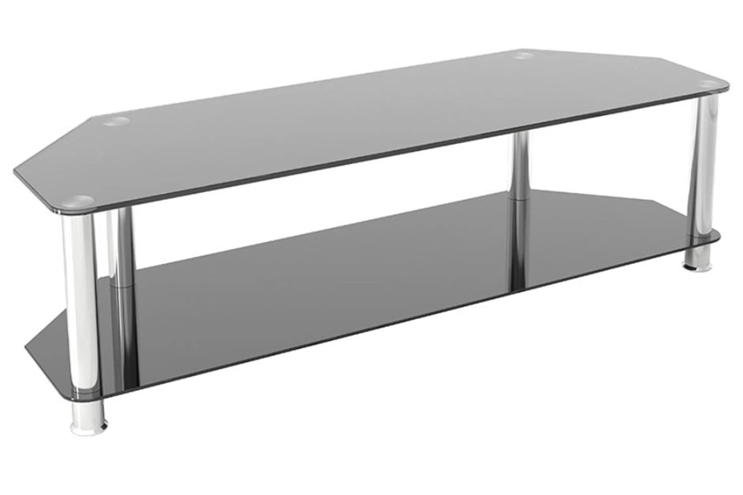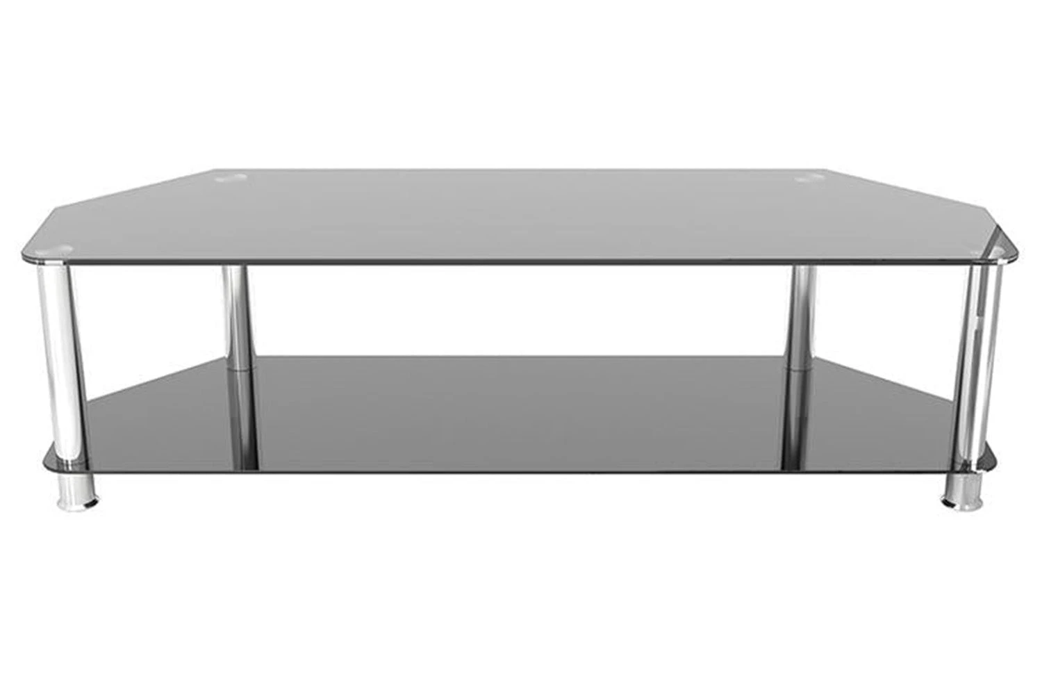 Easy to construct, contemporary and versatile solution for your home entertainment needs. The black tempered safety glass and durable stainless steel legs modernize any room while the angled corners save valuable space when placed in the corner of a room.