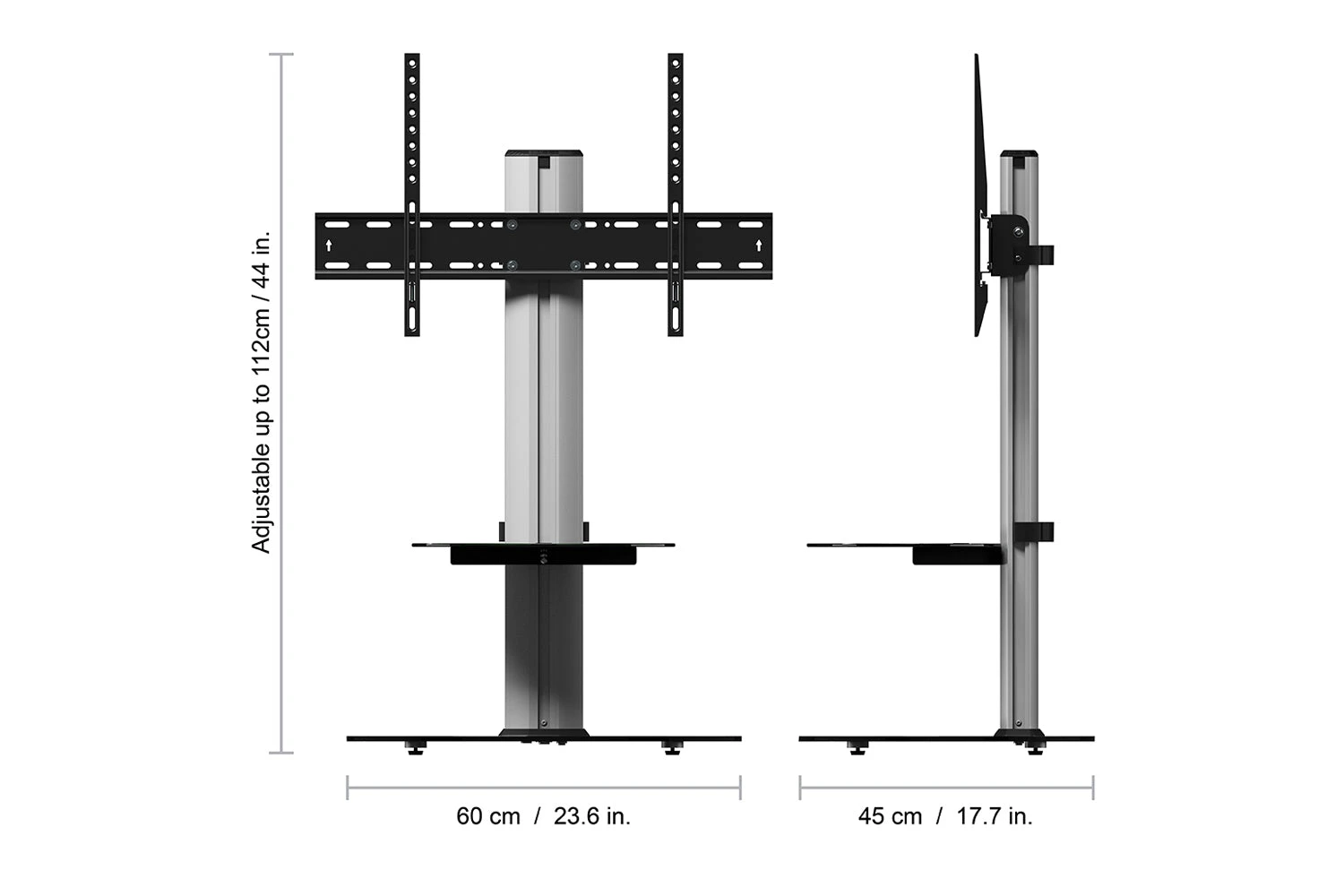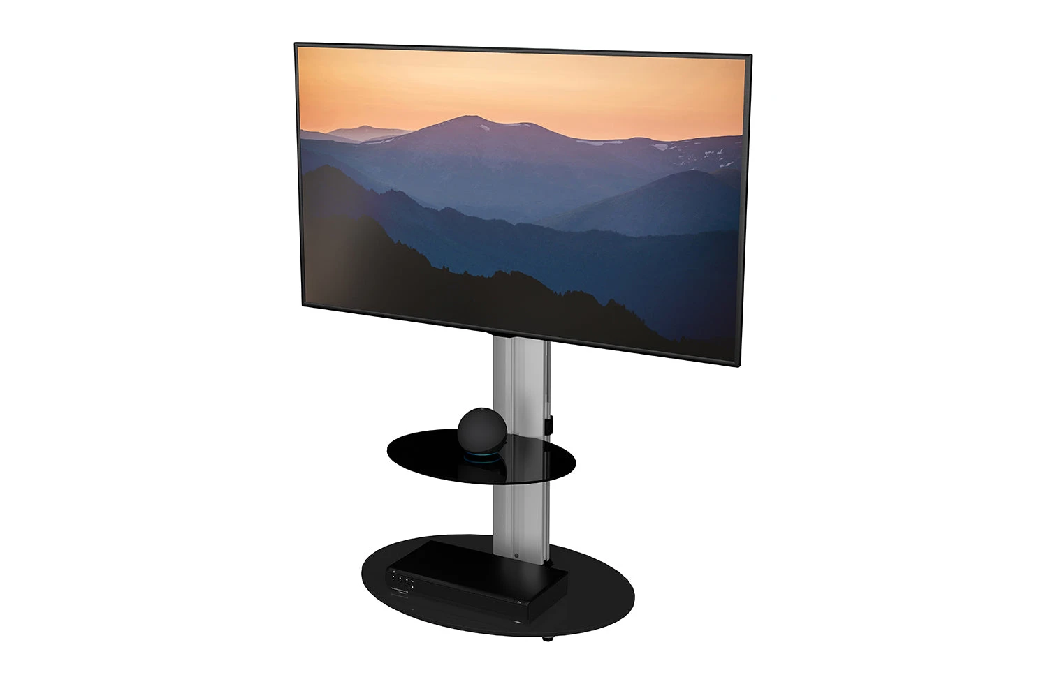 A stylish, easy alternative to wall mounting and complete TV / AV solution. This sleek swivelling column offers a secure, raised TV position for comfortable viewing from any angle. The height adjustable glass shelf and oval base provide generous open storage and fit perfectly into corners, while cables can be easily hidden at the rear.