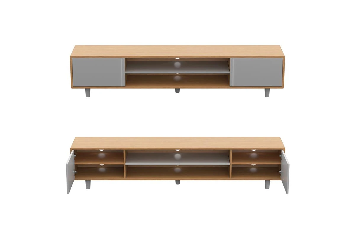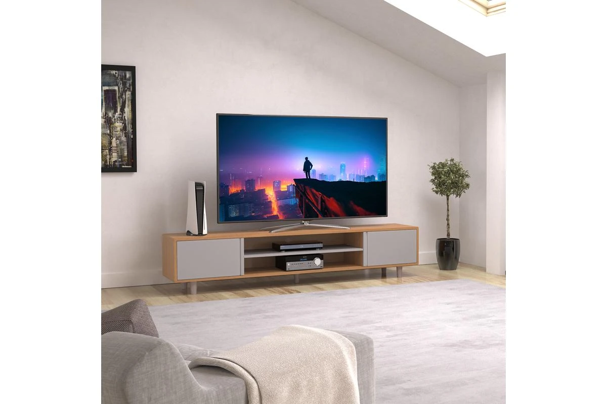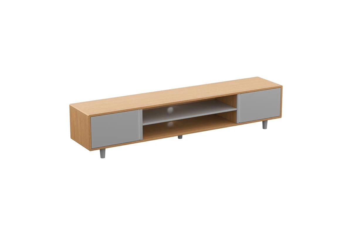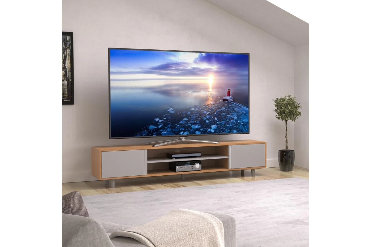 Finished in a beautiful light wood effect with contrasting light grey doors, shelf and legs. Harbour is extremely easy to assemble and features both open and closed storage with thoughtfully placed cable management holes and wide a central shelf perfect for housing a soundbar.