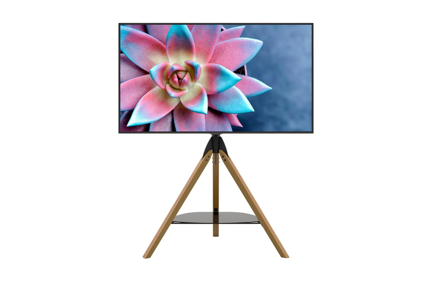 Featuring three light wood legs with a single black safety glass shelf for media devices. This on-trend piece features AVF TV mounting technology with 15 degrees of easy no tools adjustable tilt, perfect for avoiding light glare and reflections.