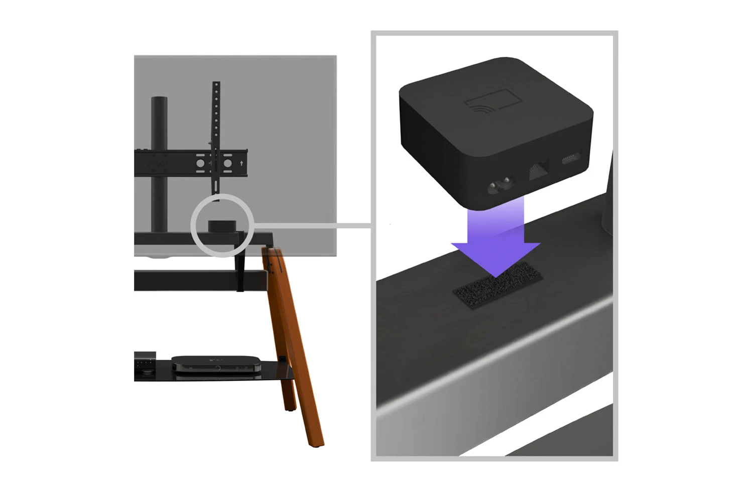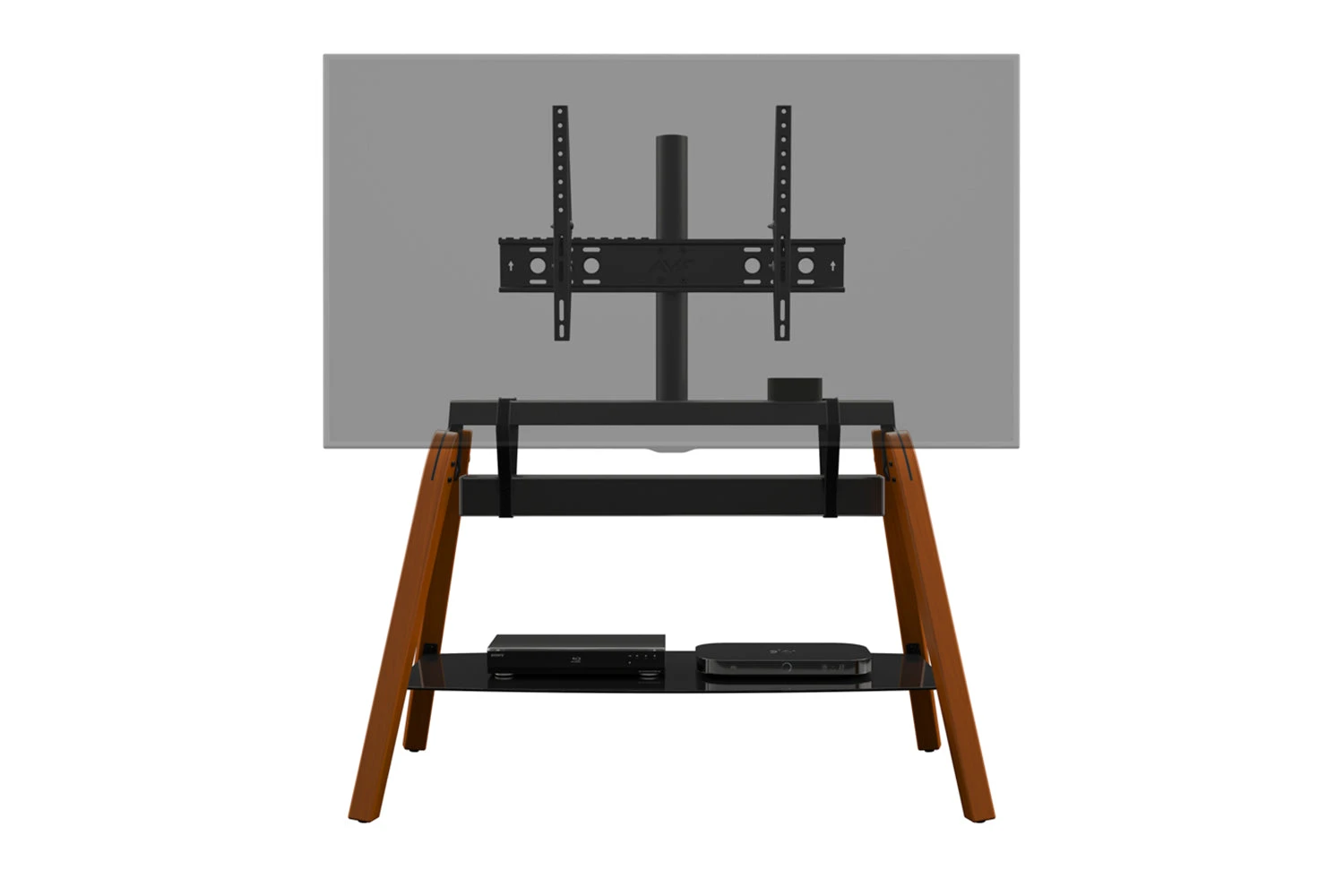 On-trend, minimal looks and trusted AVF mounting expertise combine with lovely hardwood legs to create this stunning all-in-one TV Stand. Securely mount a TV up to 86”, suspend a Soundbar directly below, and hide a small streaming device behind the screen. A broad shelf made from tempered safety glass can support any other AV device or game consoles, and cables can be routed down the back legs, out of sight.