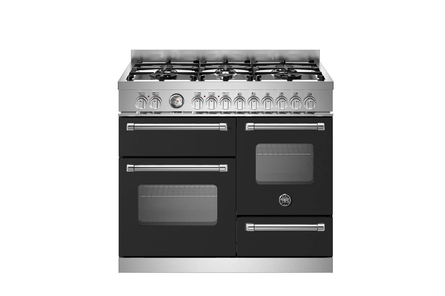 The triple-oven range cooker is the pinnacle of versality. The main oven electric oven has 11 functions, from convection, baking and grilling to warming and features a thermometer on control panel. The useful auxiliary oven, without fan, has four modes. A powerful adjustable grill is provided in the third oven.Hob has six versatile gas burners including two dual-ring power burners. Matching range hood and backsplash available.