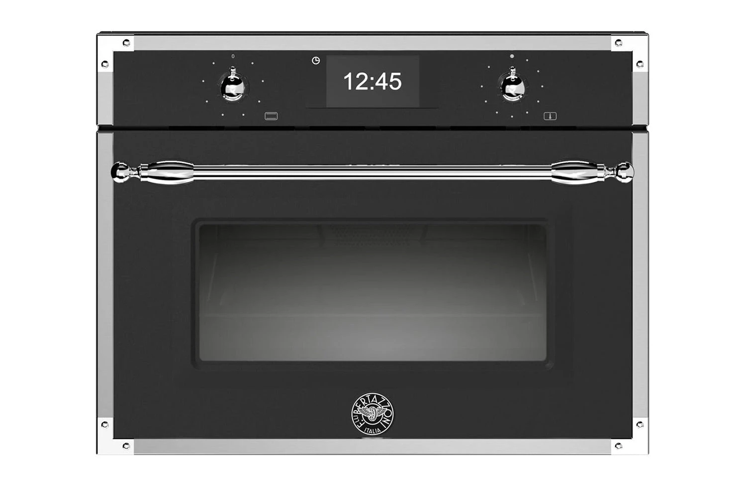 This Bertazzoni Heritage Series 60×45 cm combi steam oven has 7 functions and 38 litre capacity cavity, finished with stainless-steel. With two levels, it can easily cater for the whole family. It combines a traditional oven with convection and grill options. The full steam function offers fast, healthy cooking. Operated with full touch controls and TFT display, there is a soft opening door for ease of use. Available in matt black, nero decor, ivory with stainless steel finish and ivory with copper finish.