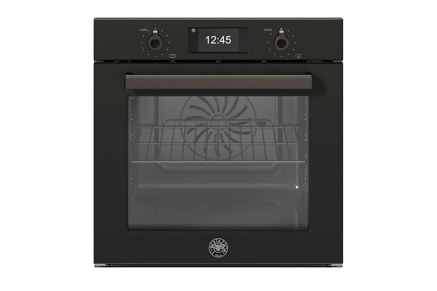 Bertazzoni Professional Series 60cm built-in electric oven with Total Steam and pyrolytic self-cleaning offers a best-in-class cavity capacity of 76 litres. With 11 functions it is ideal for mid-to low- temperature cooking, such as baking or recipes that require slow cooking, like casseroles. The non-convection mode is excellent for baking cakes, while the fan-assisted mode ensures even heat distribution on all five levels for roasting and baking with no flavour crossover. The infrared grill gives powerful searing and grilling over a large surface area. The oven is easy to control and monitor with metal or metal titanium knobs and a clear TFT display, which offers remarkable flexibility when choosing cooking modes. It also makes managing the food probe and Bertazzoni Assistant simple. The soft open-and-close door with metal or metal titanium handle is easy to use and the cool touch glass is quadruple-glazed for safety and efficiency. The Total Steam oven helps you create fast and healthy meals, using water vapour to seal in both flavour, nutrients, vitamins and minerals. This makes cooking vegetables, fish and meats quick and efficient. A removable water tank lets you remove and refill without interrupting the cooking programme. Pyrolytic cleaning is based on high-temperature cleaning and sterilising without detergents to leave your oven sparkling clean hygienic. Available in Stainless Steel and Carbonio.