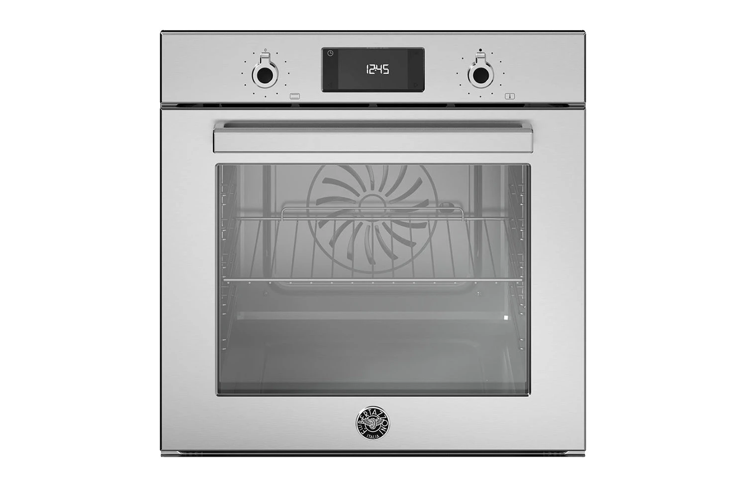 This Bertazzoni Professional Series 60cm built-in electric oven offers a best-in-class cavity capacity of 76 litres. With 11 functions it is ideal for mid-to low-temperature cooking, such as baking or recipes that require slow cooking, like casseroles. The non-convection mode is excellent for baking cakes, while the fan-assisted mode ensures even heat distribution on all five levels for roasting and baking with no flavour crossover. The infrared grill gives powerful searing and grilling over a large surface area. The oven is easy to control and monitor with metal or metal titanium knobs and a clear LCD display. The soft open-and-close door with metal or metal titanium handle is easy to use and the cool touch glass is double-glazed for safety and efficiency.