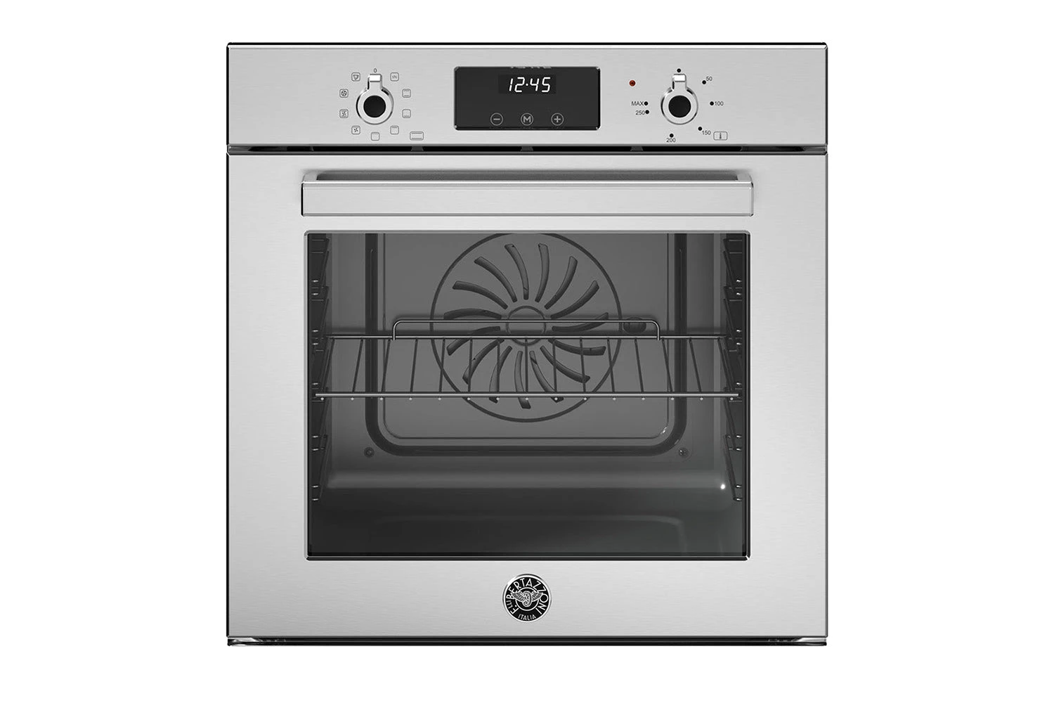 This Bertazzoni Professional Series 60cm built-in electric oven offers a best-in-class cavity capacity of 76 litres. With 9 functions it is ideal for mid-to low- temperature cooking, such as baking or recipes that require slow cooking, like casseroles. The non-convection mode is excellent for baking cakes, while the fan-assisted mode ensures even heat distribution on all five levels for roasting and baking with no flavour crossover. The infrared grill gives powerful searing and grilling over a large surface area. The oven is easy to control and monitor with metal knobs and a clear LED display. The soft opening door with metal handle is easy to use and the door is double-glazed for safety and efficiency. Available in Stainless Steel.
