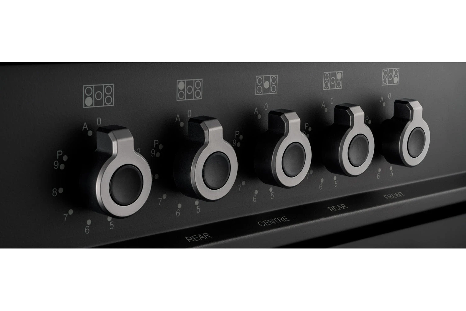 The hob has an induction top with five heating zones, including booster feature, pot detection, residual heat indicator for each zone and two flex zones.