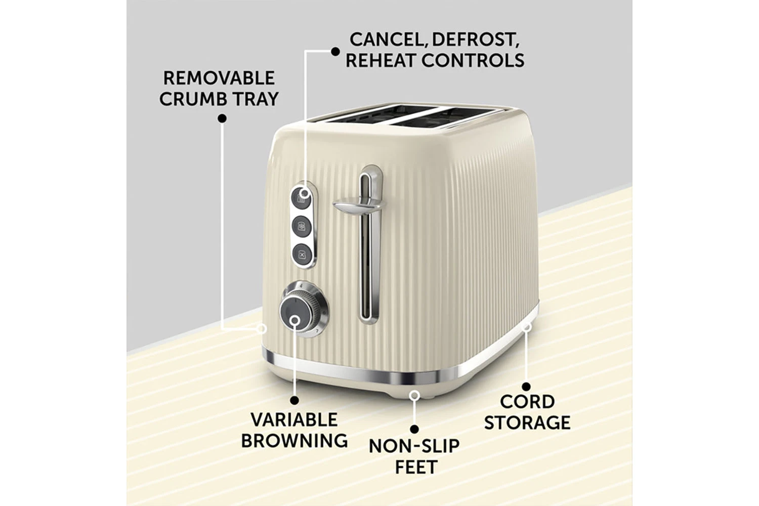 - Defrost, reheat and mid-cycle cancel functions, plus removable crumb tray, non-slip base and cord storage