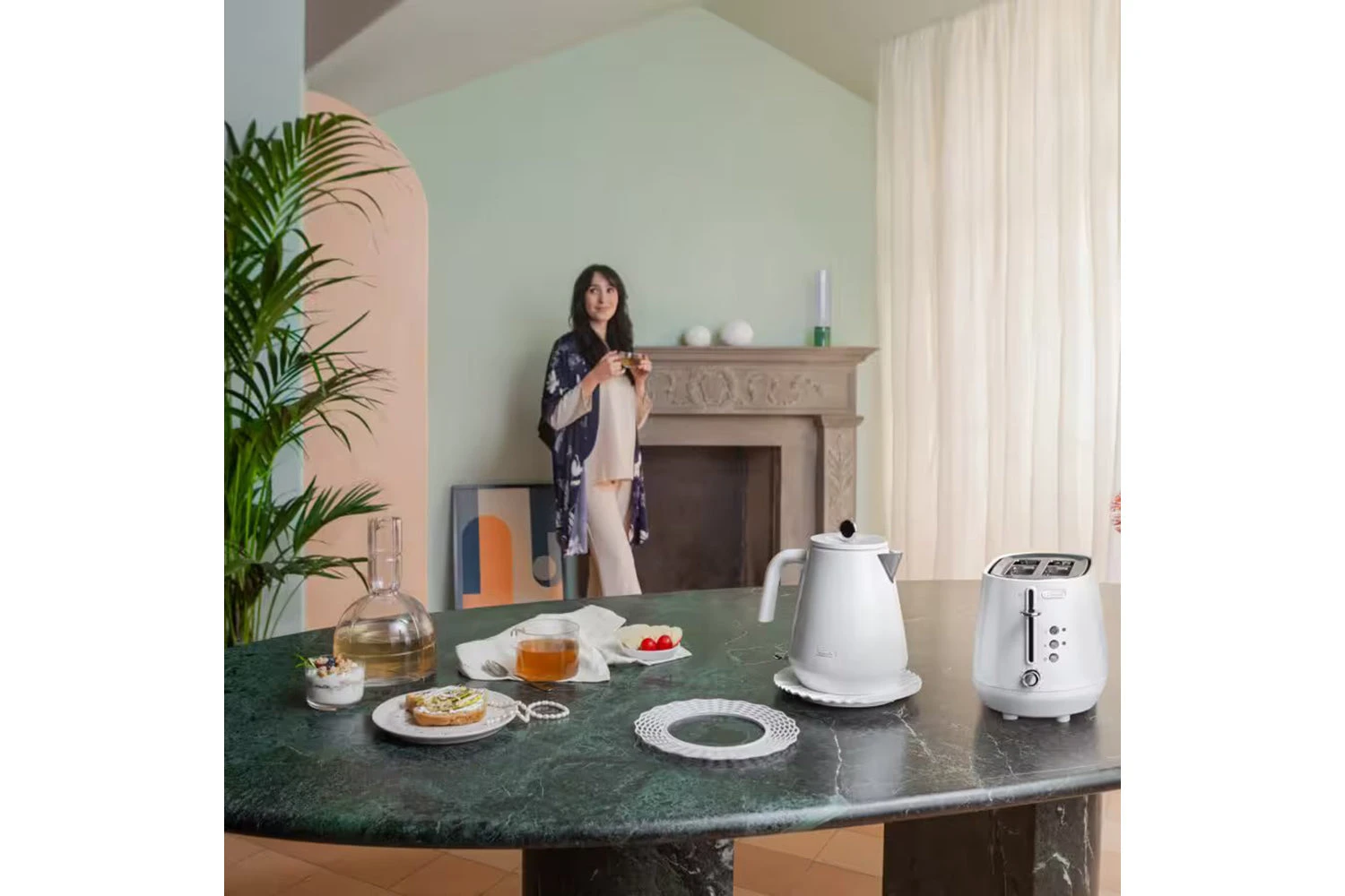 Celebrate your own uniqueness and eclecticism with the masterfully modelled De’Longhi Eclettica kettle. Its unmistakable design is rich in Italian style and complete with modern, gentle lines, making breakfasts and tea or coffee breaks a pleasure. This 3000W electric kettle with a 360° cordless base comes with a stylishly crafted saucer to reflect your mood.