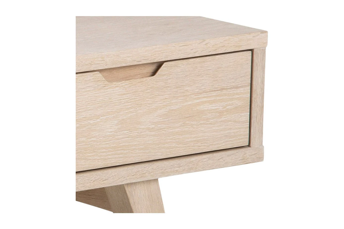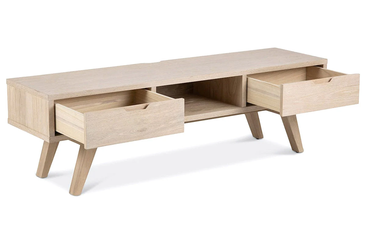 Further to looking the part, this unit has practicality at its core. Two uniquely designed yet spacious drawers offer plenty of storage space, while extra storage provided for your TV box allows for cables to be discreetly connected. The entire piece rests on angles legs, which juxtaposes perfectly with the rectangular top.