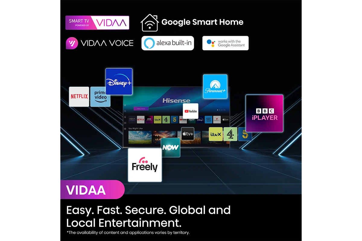 Powered by the latest VIDAA Smart platform it offers the most intuitive, fully customisable and secure OS, allowing you to watch your favourite content your way. Access all the entertainment you love from Disney+, Netflix, Prime Video, YouTube and many more.