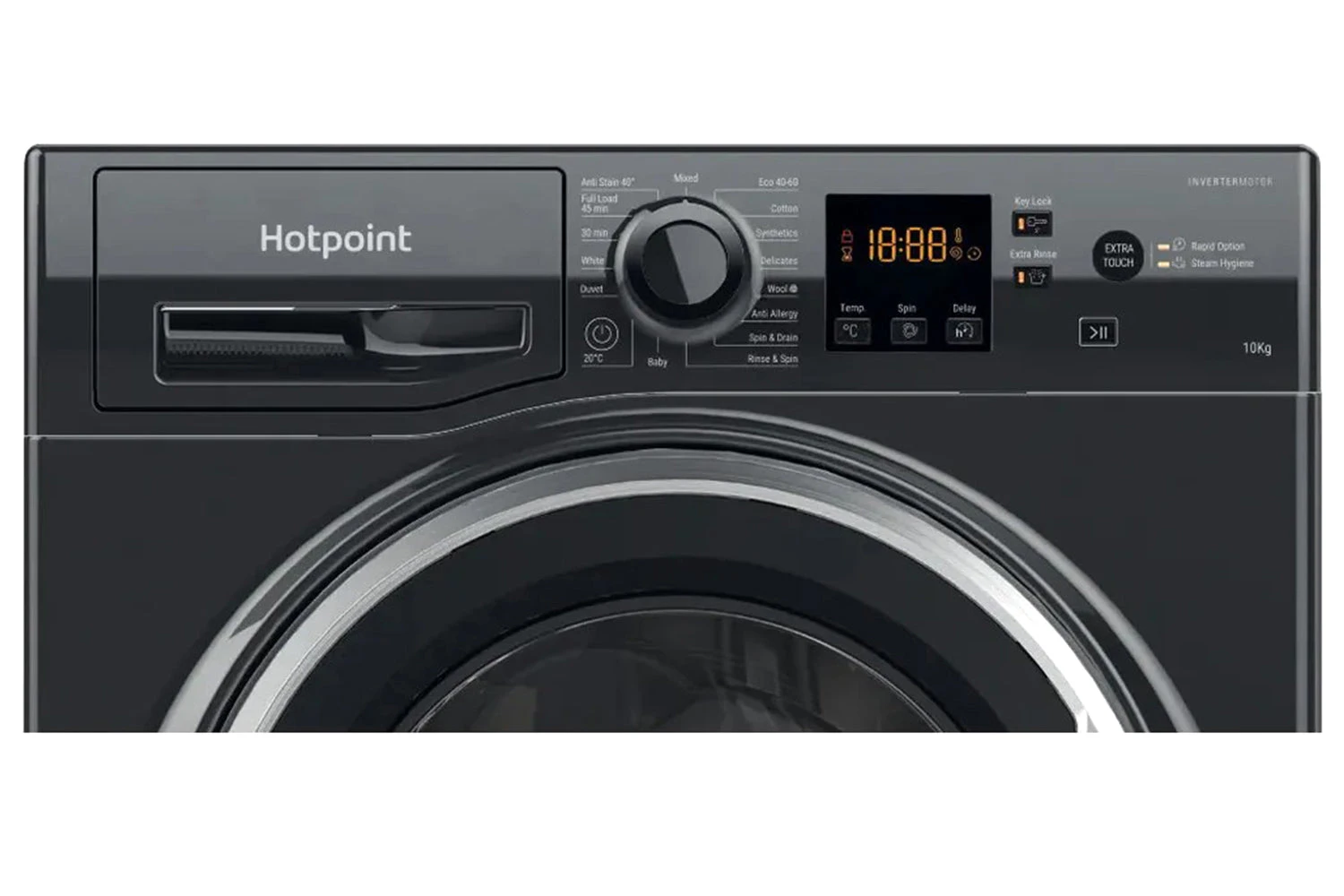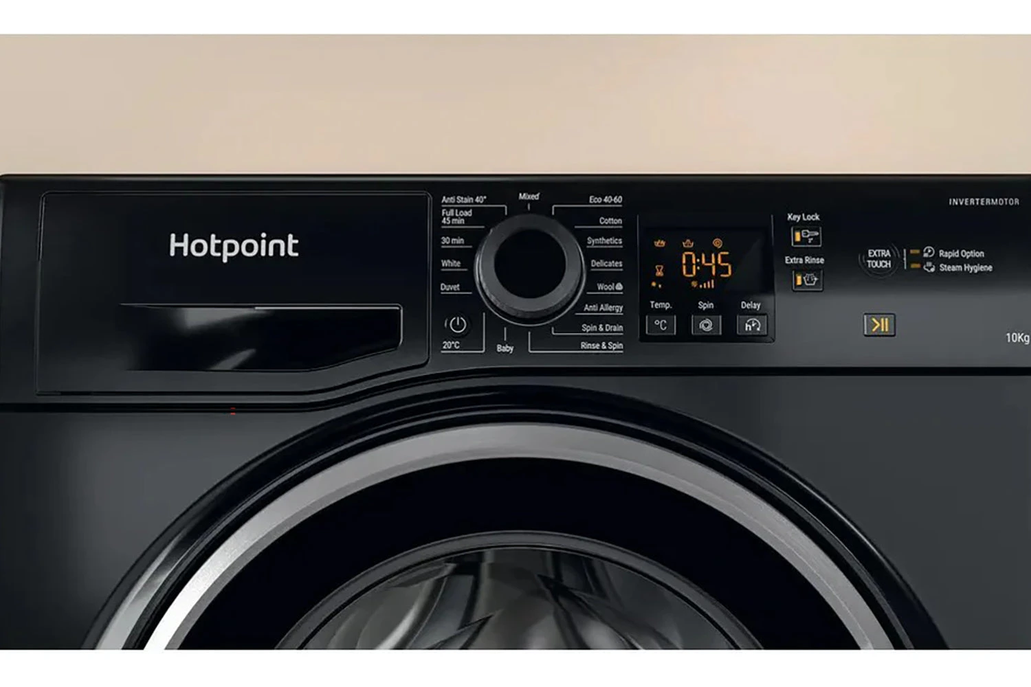 This Hotpoint Anti-stain Washing Machine in an on-trend black colour has a generous 10kg capacity for even the biggest households, with a 1400 revolutions per minute spin speed. Rated A for energy efficiency means you’ll achieve impeccable cleaning results while minimising energy usage and saving money on your bills. Say goodbye to stains and pre-treatment with the Anti-stain programme. This one-hour, 40°C cycle removes common, everyday stains without the need to pre-treat your clothes. The Full Load 45′ programme allows you to wash a full load of laundry in just 45 minutes without compromising on cleaning performance, so you can get that mountain of washing done in no time. When time isn’t on your side, the Rapid option lets you reduce the wash duration by up to 50%*, so there’s no waiting around for your much-needed items. You can also remove up to 99.9%** of bacteria from your laundry, thanks to the high-temperature Anti-allergy cycle. So, if you suffer from allergies or sensitive skin, trust Hotpoint to help. * the % will vary according to load & programme selected. **Tested by Allergy UK.