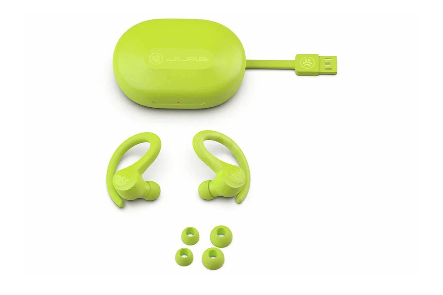 - Go air sport true wireless earbuds, charging case with integrated charging cable, 3 sets gel tips, jlab two year warranty.