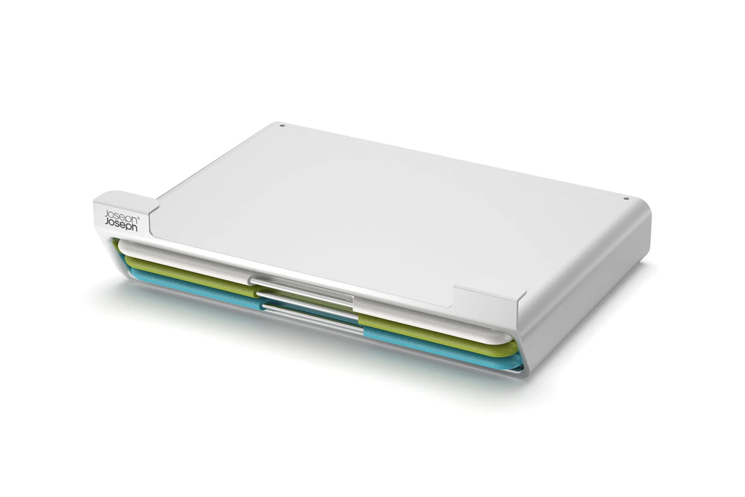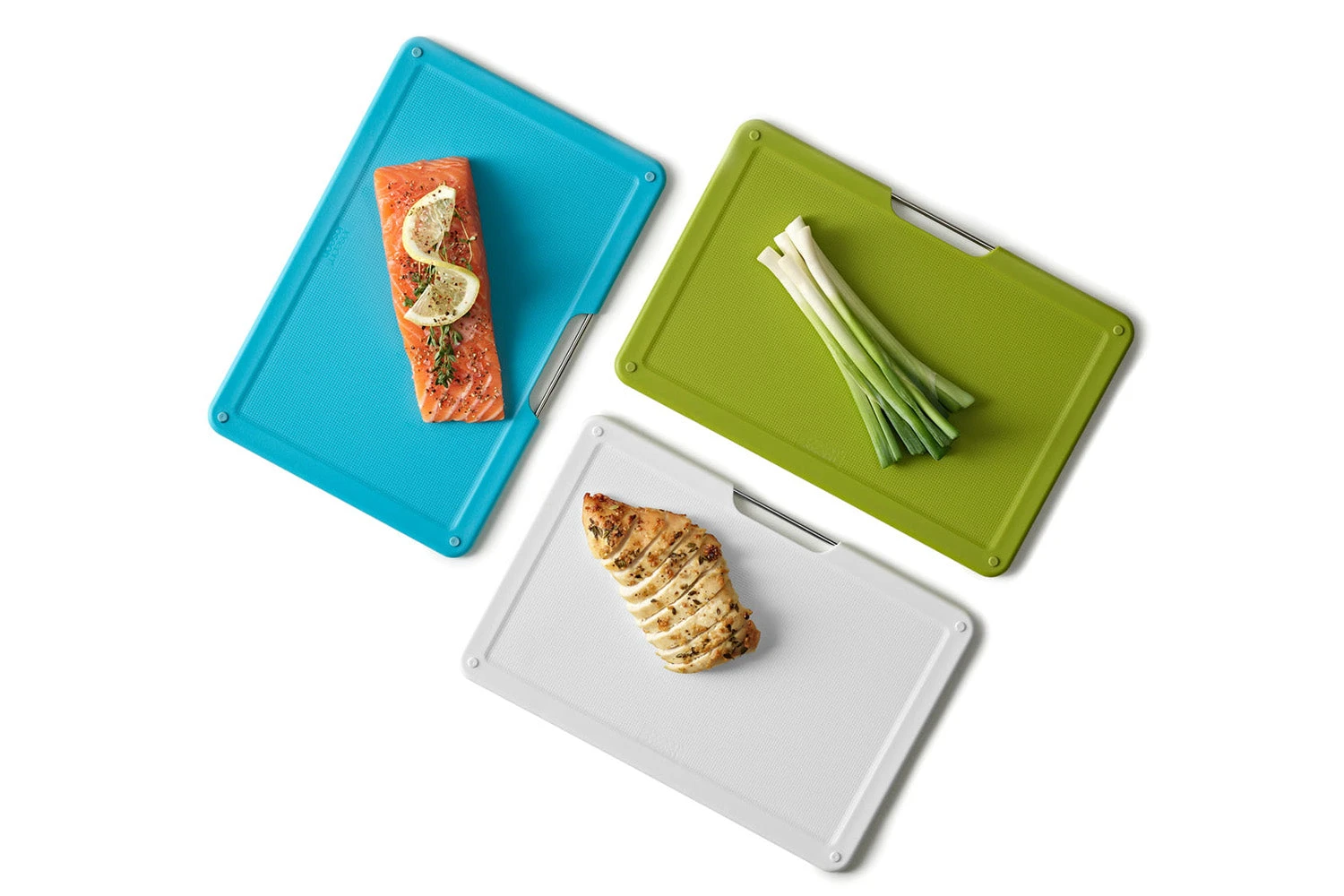 - The three chopping boards are colour-coded, so you can safely prepare all types of food.