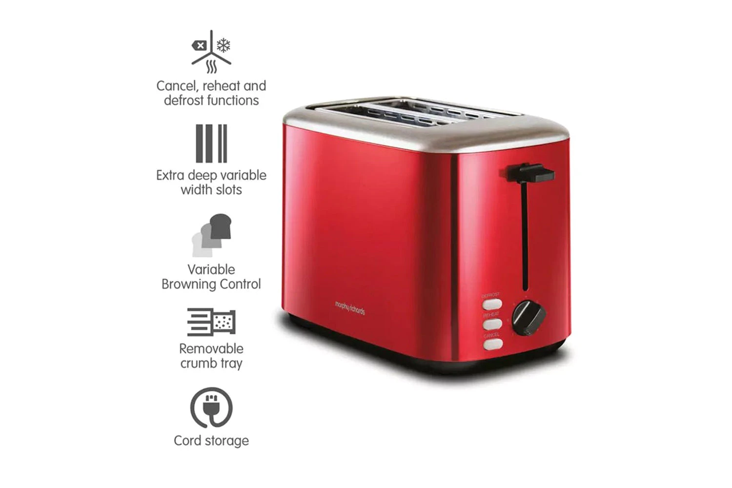 From crispy golden wholewheat to lightly charred breakfast muffins, the adjustable browning control means you can take on and toast any type of bread just the way you like it. Whether you’re looking for doorstep slabs or slender slices, Morphy Richards toaster has got it all with variable widths. Featuring a removable crumb tray and tidy cord storage, you never need to worry about mess again. Make every second count with the best of both worlds – delicious and effortless!