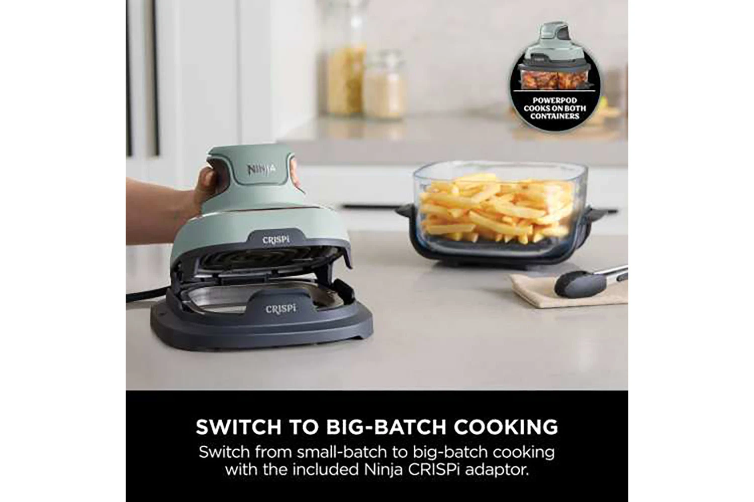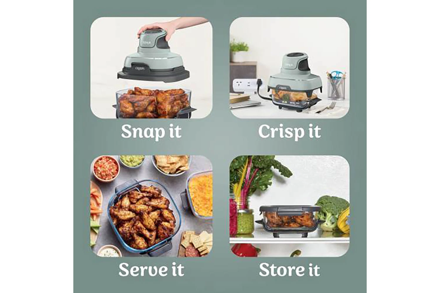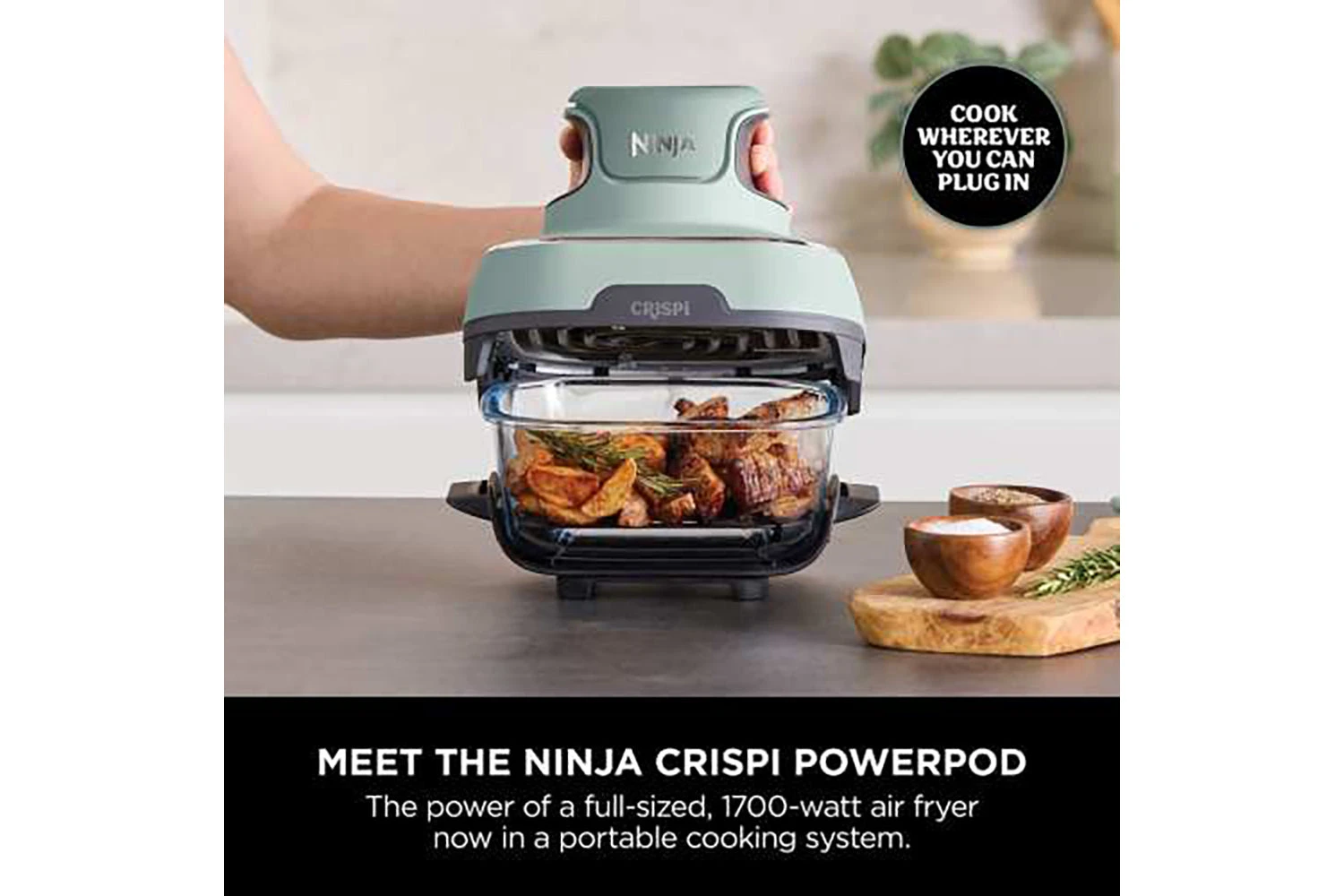 Meet the Ninja CRISPi 4-in-1 Portable Glass Air Fryer Cooking System, the power of a full sized air fryer, now in a portable cooking system. Simply snap the lightweight, handheld 1700-watt PowerPod onto one of the glass cooking containers to create family-size meals and personal portions with 4 cooking functions.