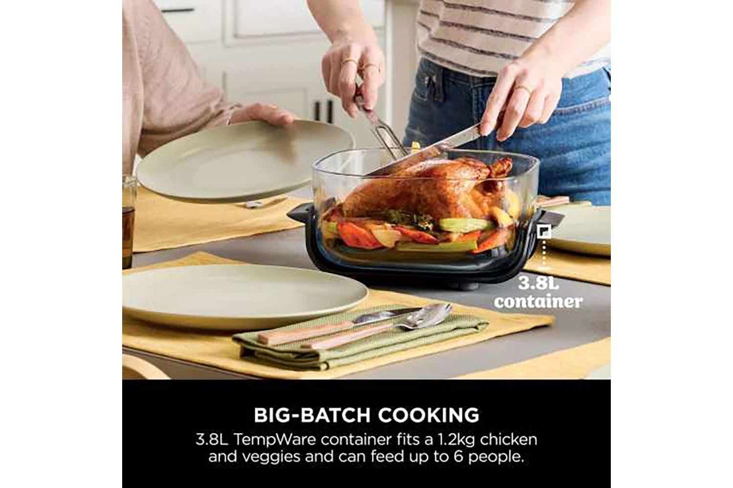 wap between the 3.8L large container for bigger portions, and the 1.4L small container for smaller portions or cooking sides. Cook a personal meal in under 15 minutes, or a whole 1.2kg chicken and vegetables. Perfect for small or big-batch cooking, meal-prepping, snacks, party food, and so much more.