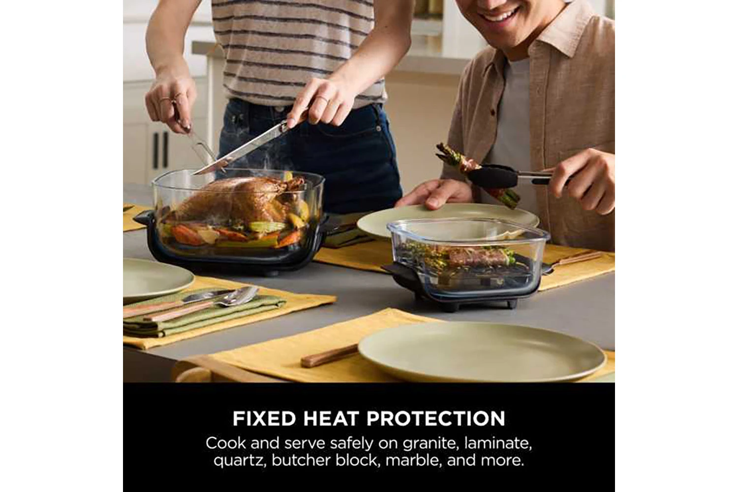 Cook and serve safely on granite, laminate, quartz, butcher block, marble and more. The TempWare glass containers feature durable, heat-resistant feet engineered to protect surfaces, and the PowerPod has heat-resistant prongs so you can set it down safely.