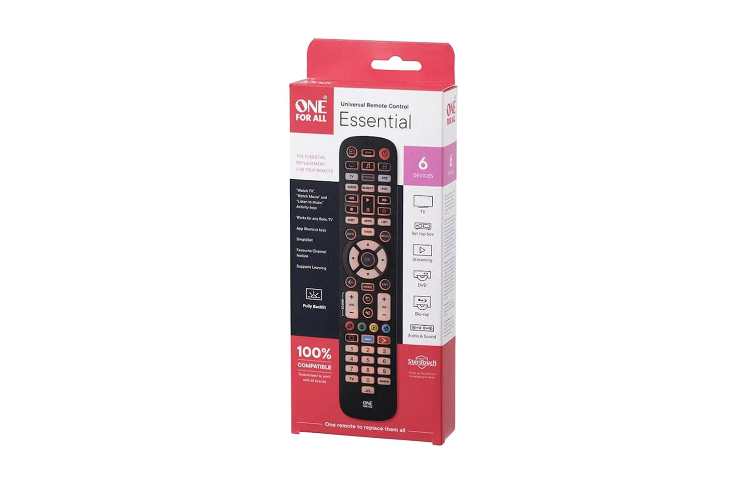 Control your TV, Set Top Box, Blu-ray/ DVD player, Streaming and Soundbar / Audio devices with this fully backlit remote.