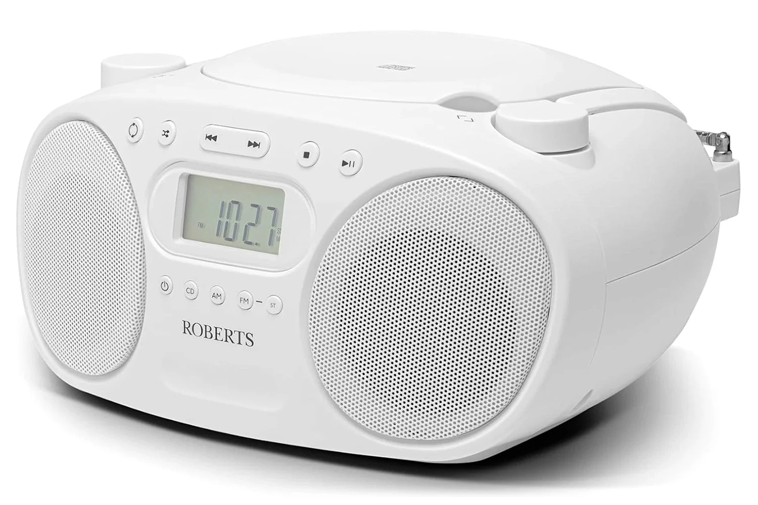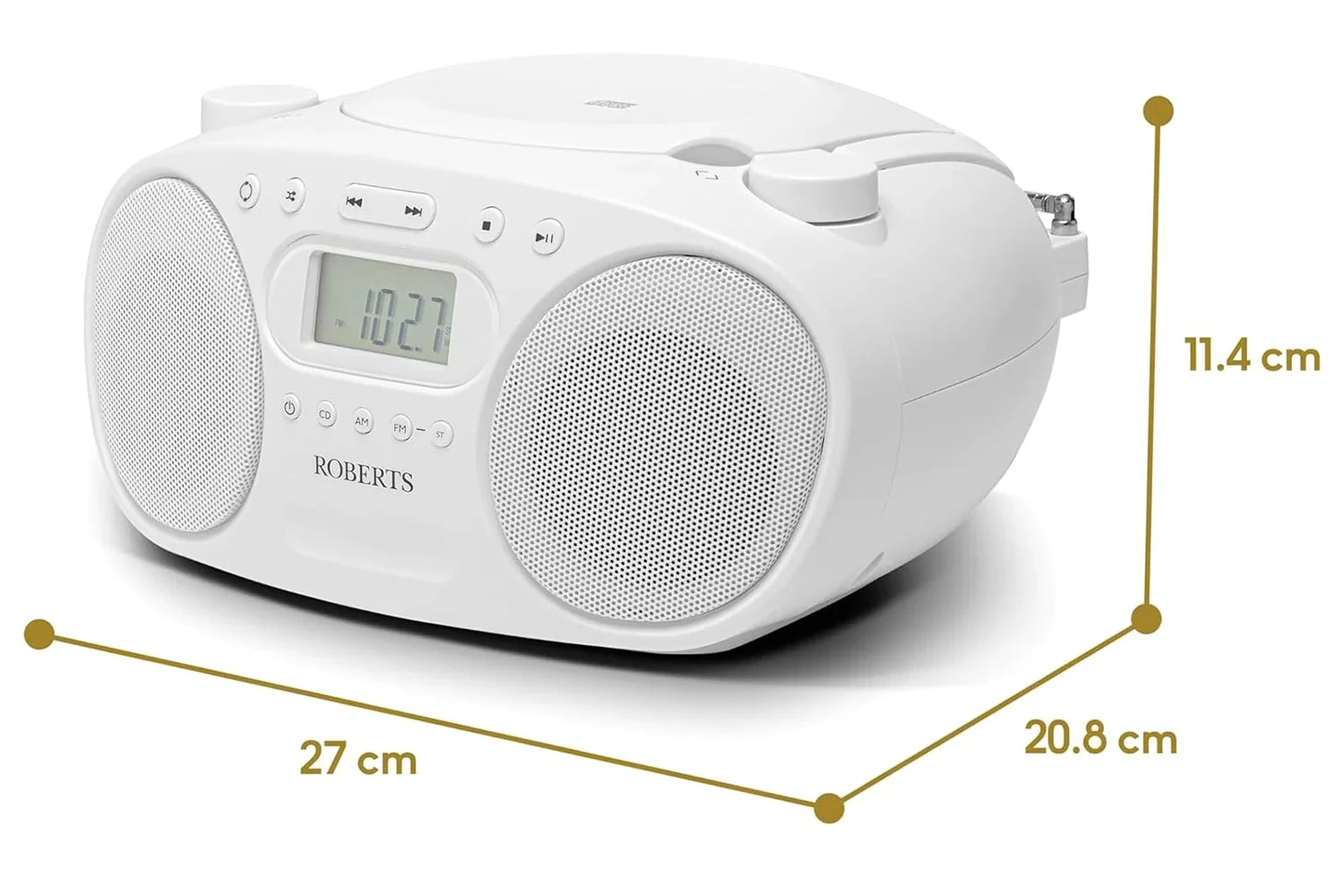 A simple and intuitive portable FM/AM radio boombox housed in a sleek portable design with CD player, headphone socket and dual speakers for clear stereo sound.