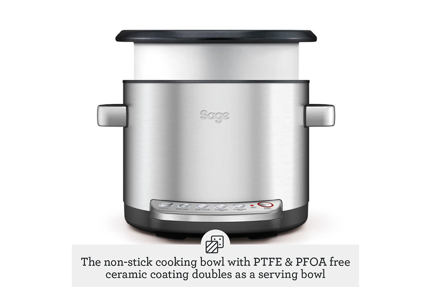One less dish to clean as the cooking bowl with PTFE and PFOA free ceramic coating doubles as a serving bowl. So sit back and relax knowing you have less dishes to clean up.