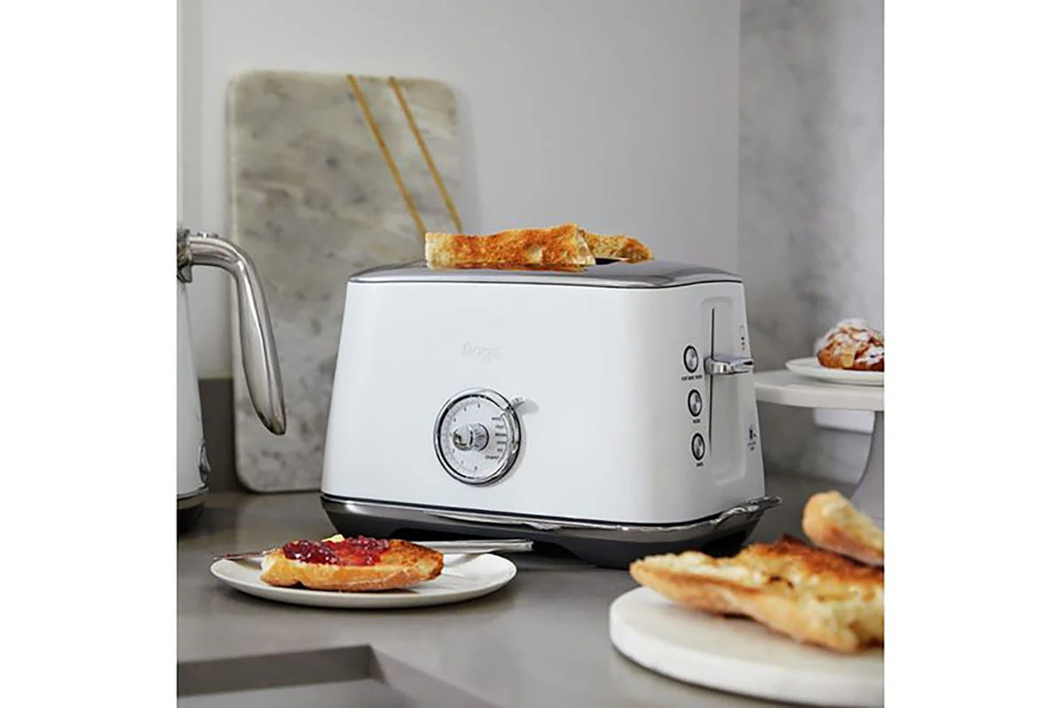 The Toast Select Luxe with 6 bread settings – White, Brown, Grain, Fruit, Rye and Crumpet adjusts the toasting time for each type of bread.