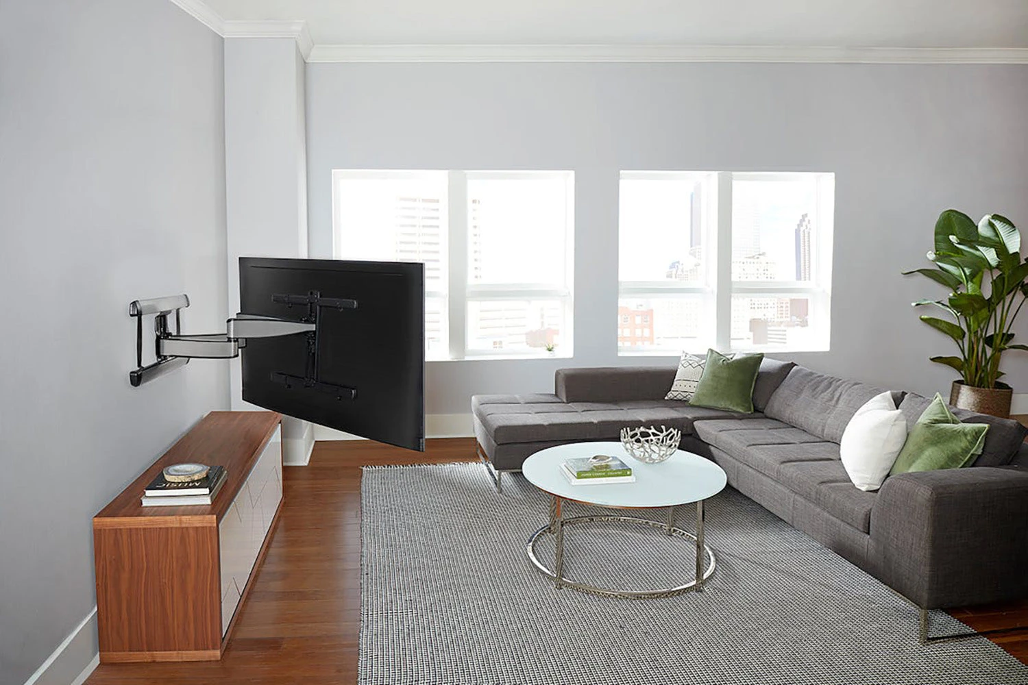 With a lower profile depth than traditional full-motion mounts, the Advanced Full-Motion Mount positions TVs closer to the wall creating a more streamlined look.