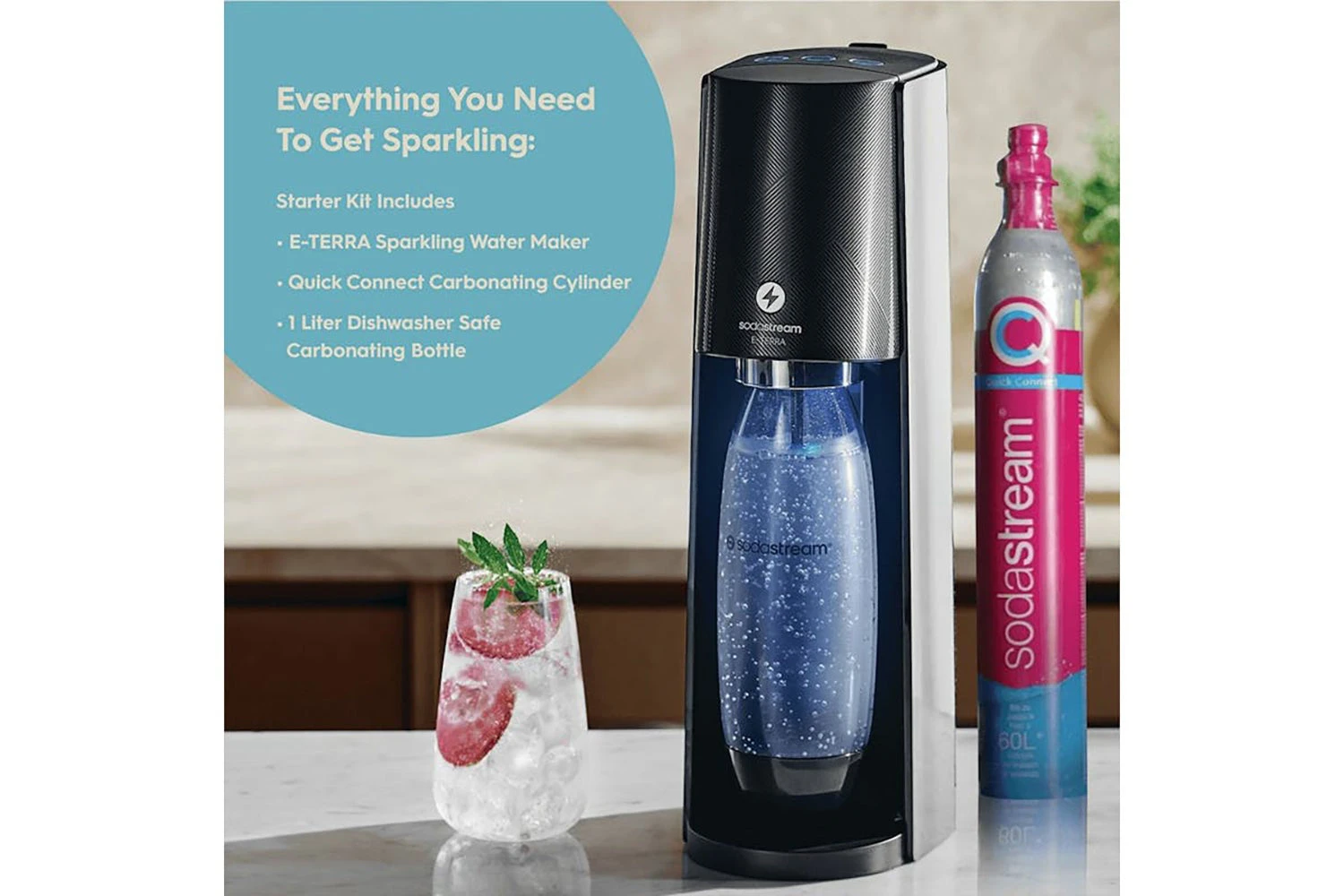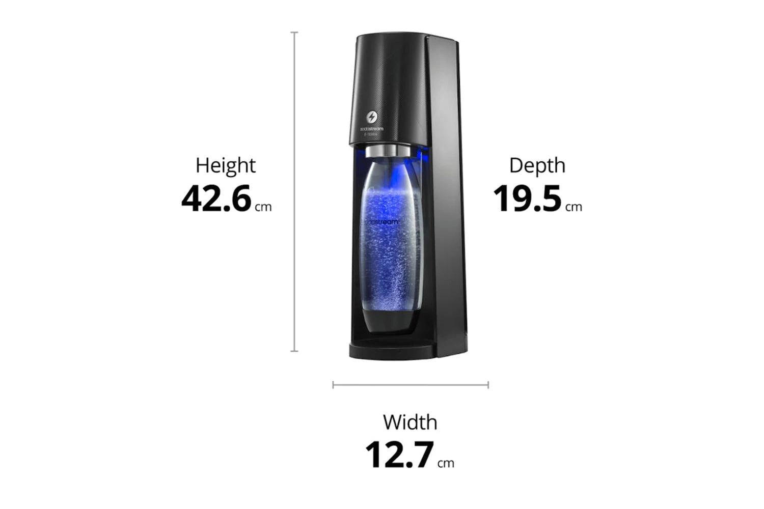 The SodaStream E-TERRA electric Sparkling Water Maker offers the perfect carbonation experience in one simple touch. With its One-Touch electrical technology it ensures consistent levels of carbonation. The LED electric carbonation illuminates and enhances the magic moment of carbonation. It is also features the new Patented quick connect system for simple and Intuitive cylinder connection and Bottle Snap & Lock unique technology. The SodaStream E-TERRA is designed with techy style textures and the best user experience.