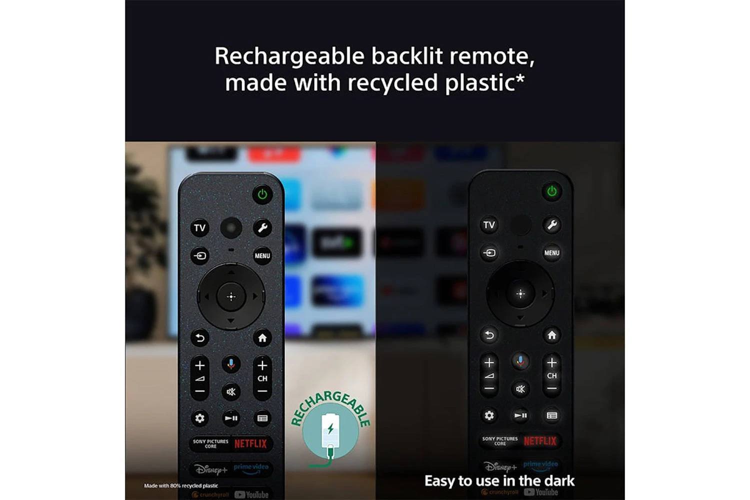 Sony new premium Eco Remote(2) uses 80% recycled plastic, is rechargeable, easy to clean, and backlit, so you can still see the buttons on dark movie nights!