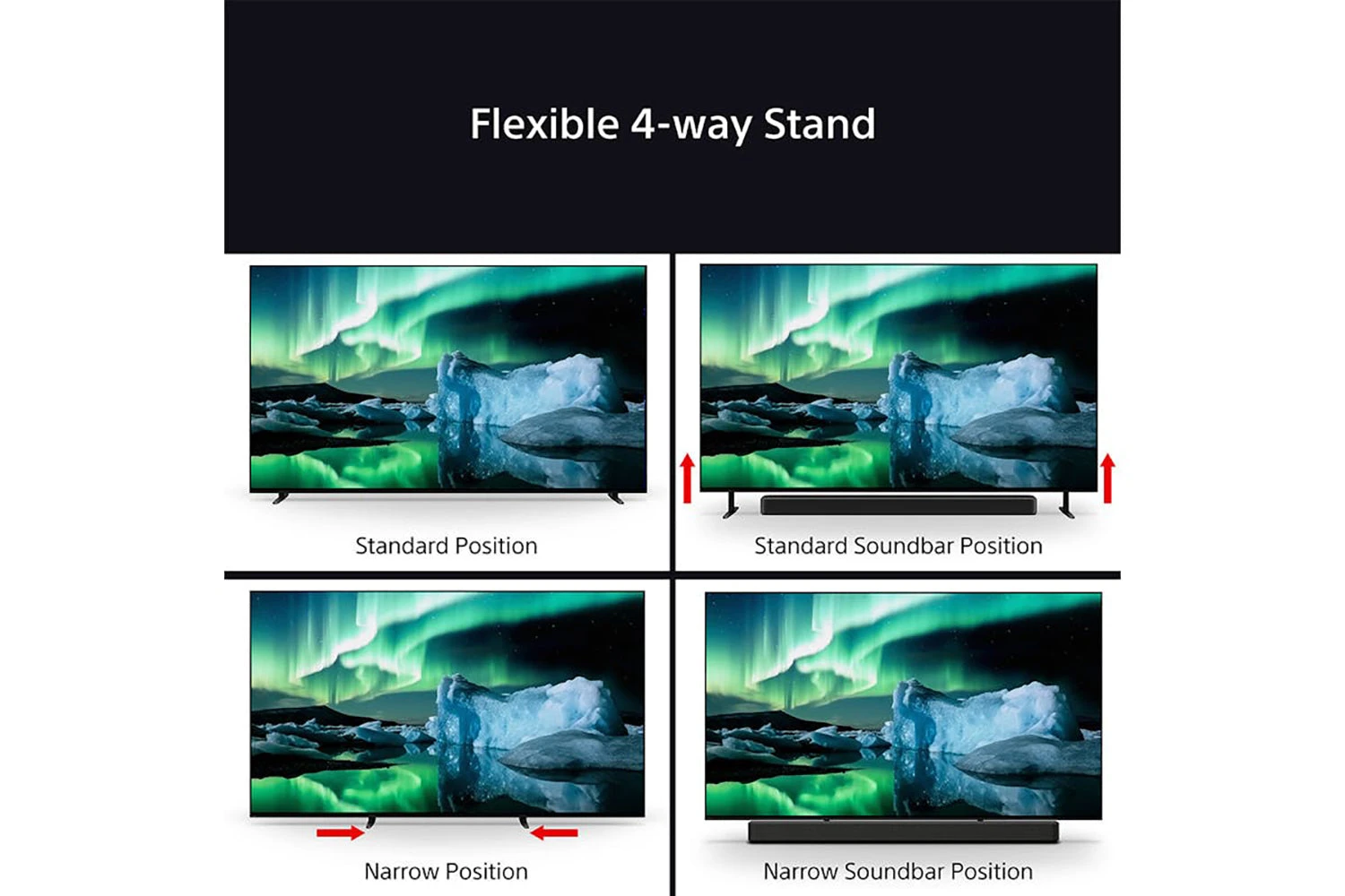 Absolute flexibility. Sony 4-way stand gives you the choice of an outside position, an inside position for smaller shelves or two soundbar positions to meet your viewing preference.