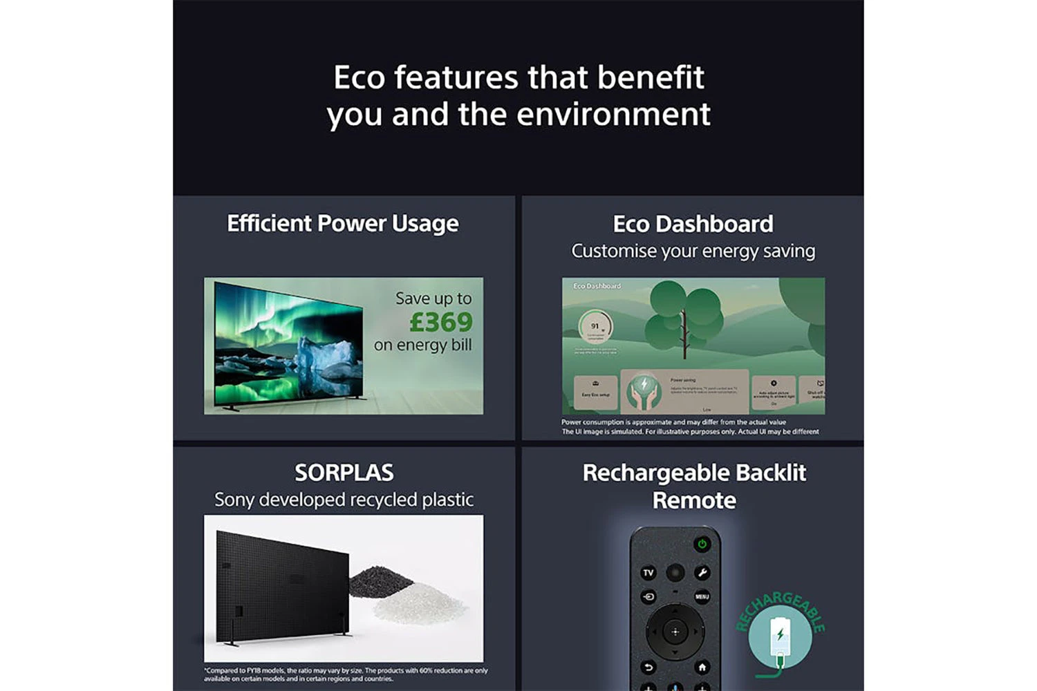Sony-developed SORPLAS recycled plastics are used in sony TVs to reduce virgin plastics by approximately 60 while maintaining durability. This TV also uses recycled materials for optical parts and 48 less plastic in its packaging.