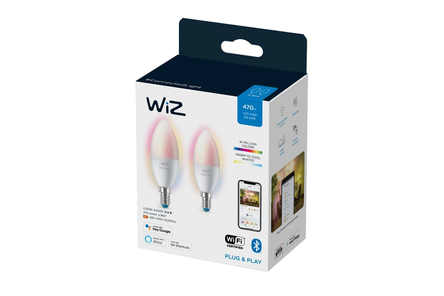 The wiz led full-color candle-shape bulb brings smart lighting for your daily living. Perfect for any decorative fixtures with e14 medium base. Create the ambience of your choice with 16 million colours, as well as warm to cool white light. You can set schedules to turn lights on and off according to your daily or weekly routines, control with your smartphone or your voice and have remote access to your lights even when you’re away. Wiz lights connect to your existing wi-fi, no additional hardware is needed.